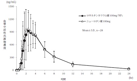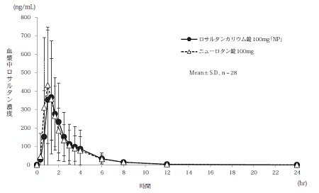 ロサルタンカリウム錠100mg「NP」とニューロタン錠100mgのそれぞれ1錠(ロサルタンカリウムとして100mg)を、クロスオーバー法により健康成人男子に絶食単回経口投与して血漿中ロサルタン濃度及び活性代謝物濃度を測定した。得られたそれぞれの薬物動態パラメータ(AUC0→24hr、Cmax)について統計解析を行った結果、両剤の生物学的同等性が確認された8)。