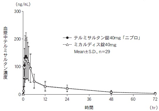 テルミサルタン錠40mg「ニプロ」とミカルディス錠40mgのそれぞれ1錠(テルミサルタンとして40mg)を、クロスオーバー法により健康成人男子に絶食単回経口投与して血漿中テルミサルタン濃度を測定した。得られた薬物動態パラメータ(AUC0→72hr、Cmax)について90%信頼区間法にて統計解析を行った結果、log(0.80)~log(1.25)の範囲内であり、両剤の生物学的同等性が確認された11)。