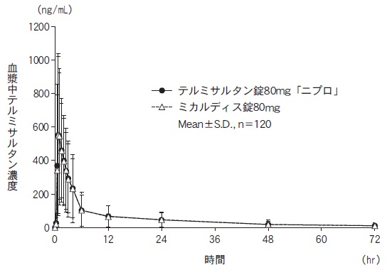 テルミサルタン錠80mg「ニプロ」とミカルディス錠80mgのそれぞれ1錠(テルミサルタンとして80mg)を、クロスオーバー法により健康成人男子に絶食単回経口投与して血漿中テルミサルタン濃度を測定した。得られた薬物動態パラメータ(AUC0→72hr、Cmax)について90%信頼区間法にて統計解析を行った結果、log(0.80)~log(1.25)の範囲内であり、両剤の生物学的同等性が確認された12)。