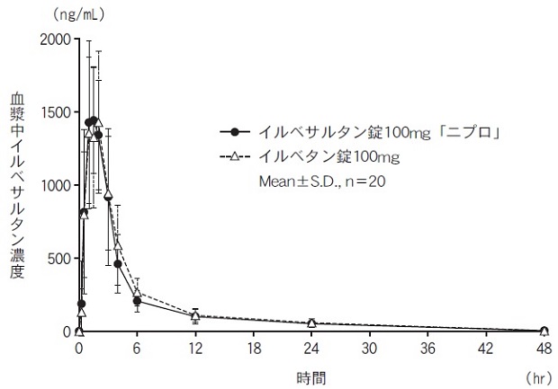 イルベサルタン錠100mg「ニプロ」とイルベタン錠100mgのそれぞれ1錠(イルベサルタンとして100mg)を、クロスオーバー法により健康成人男子に絶食単回経口投与して血漿中イルベサルタン濃度を測定した。得られた薬物動態パラメータ(AUC0→48hr、Cmax)について90%信頼区間法にて統計解析を行った結果、log(0.80)~log(1.25)の範囲内であり、両剤の生物学的同等性が確認された7)。