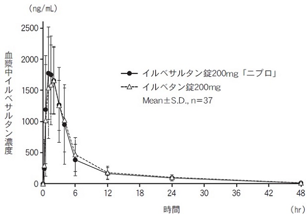 イルベサルタン錠200mg「ニプロ」とイルベタン錠200mgのそれぞれ1錠(イルベサルタンとして200mg)を、クロスオーバー法により健康成人男子に絶食単回経口投与して血漿中イルベサルタン濃度を測定した。得られた薬物動態パラメータ(AUC0→48hr、Cmax)について90%信頼区間法にて統計解析を行った結果、log(0.80)~log(1.25)の範囲内であり、両剤の生物学的同等性が確認された8)。