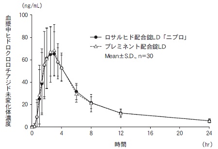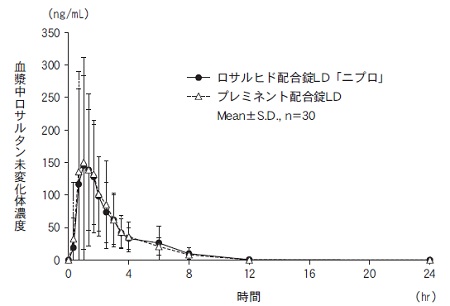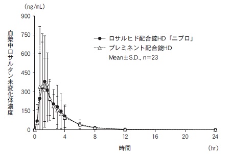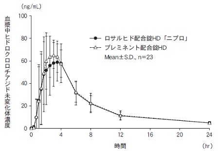 ロサルタンカリウム/ヒドロクロロチアジド50mg/12.5mgを1日1回7日間反復経口投与後のロサルタン及びカルボン酸体の血漿中濃度は、非高齢者と差はなく、ヒドロクロロチアジドの吸収も非高齢者と差がなかった(外国人データ)17)。