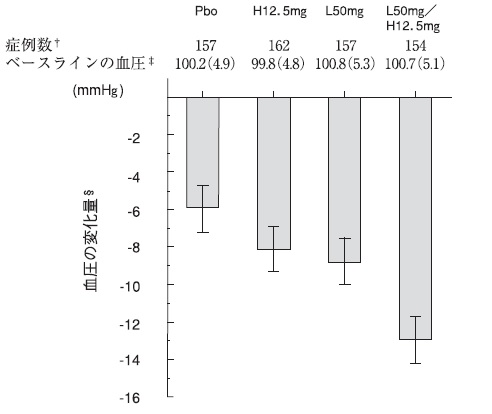 ロサルタンカリウム/ヒドロクロロチアジド50mg/12.5mgを8週間服用後に血圧コントロールが不十分であった日本人本態性高血圧症患者を対象に長期安全性を評価した第Ⅲ相試験の二重盲検期(8週間)において、ロサルタンカリウム/ヒドロクロロチアジド100mg/12.5mgはロサルタンカリウム/ヒドロクロロチアジド50mg/12.5mgと比べて、投与8週時の平均トラフ坐位拡張期血圧では同程度の降圧効果を示し、投与8週時の平均トラフ坐位収縮期血圧では上乗せの降圧効果を示した。投与8週時における平均トラフ坐位血圧のベースラインからの変化量を表2に示す23),24)。