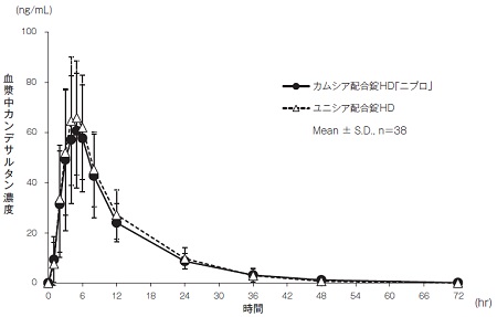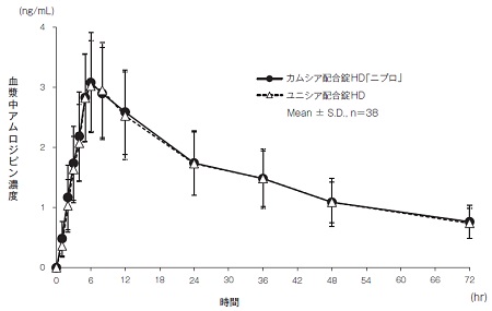 カムシア配合錠HD「ニプロ」とユニシア配合錠HDのそれぞれ1錠(カンデサルタン シレキセチルとして8mg、アムロジピンとして5mg)を、クロスオーバー法により健康成人男子に絶食時に単回経口投与して血漿中カンデサルタン濃度及びアムロジピン濃度を測定した。得られたそれぞれの薬物動態パラメータ(AUC0→72hr、Cmax)について90%信頼区間法にて統計解析を行った結果、log(0.80)~log(1.25)の範囲内であり、両剤の生物学的同等性が確認された9)。