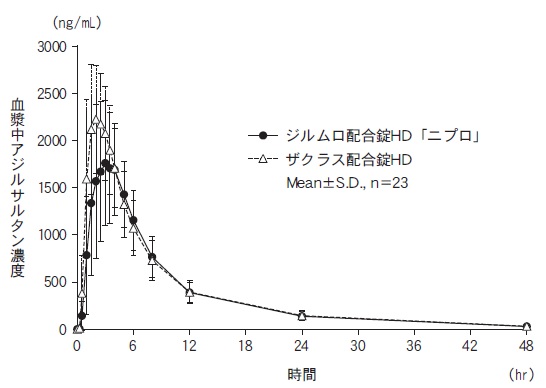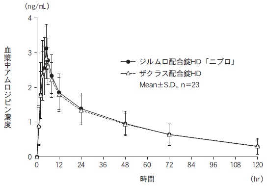 ジルムロ配合錠HD「ニプロ」とザクラス配合錠HDのそれぞれ1錠(アジルサルタンとして20mg、アムロジピンとして5mg)を、クロスオーバー法により健康成人男子に絶食単回経口投与して血漿中アジルサルタン濃度と血漿中アムロジピン濃度を測定した。得られた薬物動態パラメータ(AUC0→48又は120hr、Cmax)について90%信頼区間法にて統計解析を行った結果、log(0.80)~log(1.25)の範囲内であり、両剤の生物学的同等性が確認された8)。