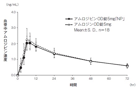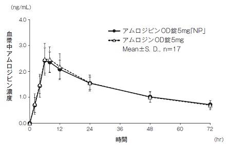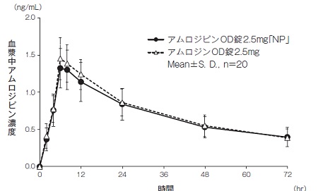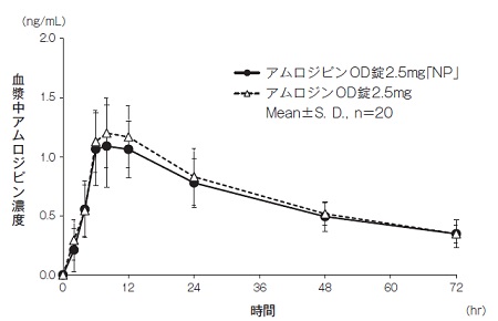 アムロジピンOD錠2.5mg「NP」とアムロジンOD錠2.5mgのそれぞれ1錠(アムロジピンとして2.5mg)を、クロスオーバー法により健康成人男子に絶食単回経口投与して血漿中アムロジピン濃度を測定した。得られた薬物動態パラメータ(AUC0→72hr、Cmax)について90%信頼区間法にて統計解析を行った結果、log(0.80)~log(1.25)の範囲内であり、両剤の生物学的同等性が確認された8),9)。