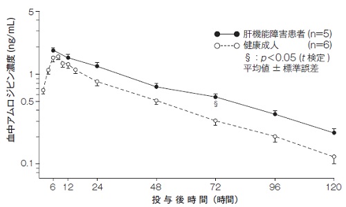 成人肝硬変患者(Child A、Bクラス)5例にアムロジピンとして2.5mgを単回経口投与した場合の薬物動態は図及び表のとおりであった 。健康成人に比較して、投与72時間後の血中濃度が有意に上昇し、T1/2、AUCはやや高値を示したが有意差は認められなかった15)。