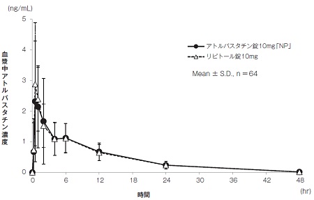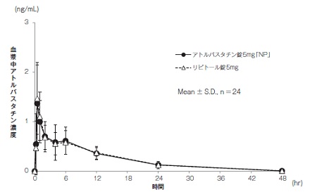 健康成人6例に、アトルバスタチン5注1)、10、20及び40mgを絶食下単回経口投与した結果、血漿中未変化体のCmax及びAUC0-∞は投与量に比例して増加し、Tmax及び半減期はほぼ一定であったことから、アトルバスタチンの体内動態は線形性を示すと考えられた1)。なお、日本人と外国人との体内動態を比較した結果、個人差を上回る人種差は認められなかった2)。