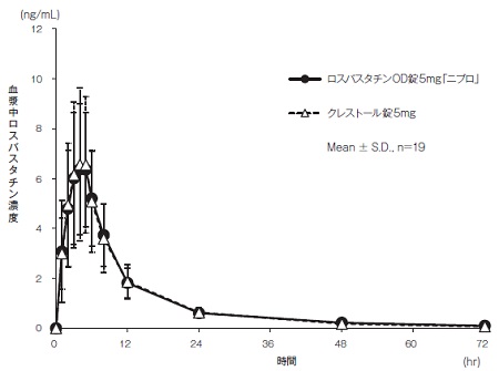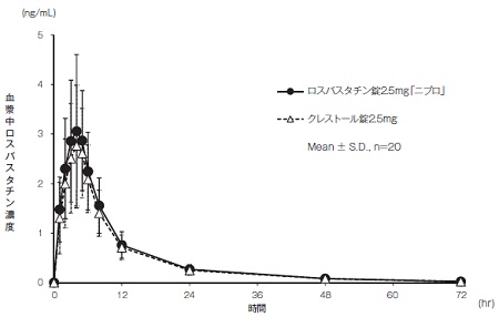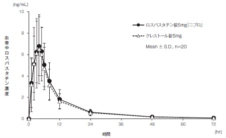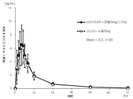 5) 単回投与後の血漿中濃度(クレストール錠:2005年1月19日承認、申請資料概要へ.3.3.1.2)(L20200978)