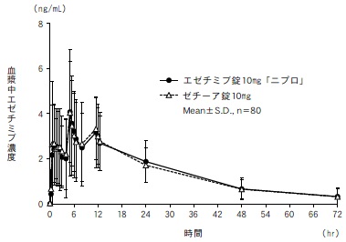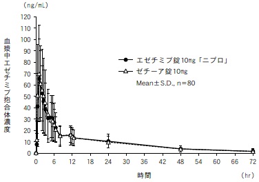 エゼチミブ錠10mg「ニプロ」とゼチーア錠10mgのそれぞれ1錠(エゼチミブとして10mg)を、クロスオーバー法により健康成人男子に絶食単回経口投与して血漿中活性代謝物(エゼチミブ抱合体)濃度及び血漿中エゼチミブ濃度を測定した。得られた薬物動態パラメータ(AUC0→72hr、Cmax)について90%信頼区間法にて統計解析を行った結果、log(0.80)~log(1.25)の範囲内であり、両剤の生物学的同等性が確認された8)。
