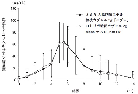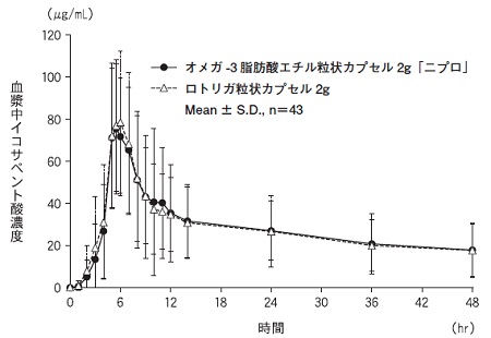 オメガ−3脂肪酸エチル粒状カプセル2g「ニプロ」とロトリガ粒状カプセル2gのそれぞれ1包(オメガ-3脂肪酸エチルとして2g)を、クロスオーバー法により健康成人男子に食直後単回経口投与して血漿中イコサペント酸及びドコサヘキサエン酸濃度を測定した。投与前値で補正した値より得られた薬物動態パラメータ(ΔAUC、ΔCmax)について90%信頼区間法にて統計解析を行った結果、log(0.80)~log(1.25)の範囲内であり、両剤の生物学的同等性が確認された6)。