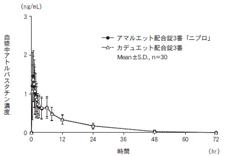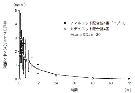 本剤(アムロジピン・アトルバスタチン配合剤)は次の4製剤がある。1番:アムロジピン2.5mg/アトルバスタチン5mg2番:アムロジピン2.5mg/アトルバスタチン10mg3番:アムロジピン5mg/アトルバスタチン5mg4番:アムロジピン5mg/アトルバスタチン10mg上記配合用量以外の用量を投与する場合は、個別のアムロジピン製剤又はアトルバスタチン製剤を用いることができるが、それぞれの成分の用法・用量の範囲内で投与すること。