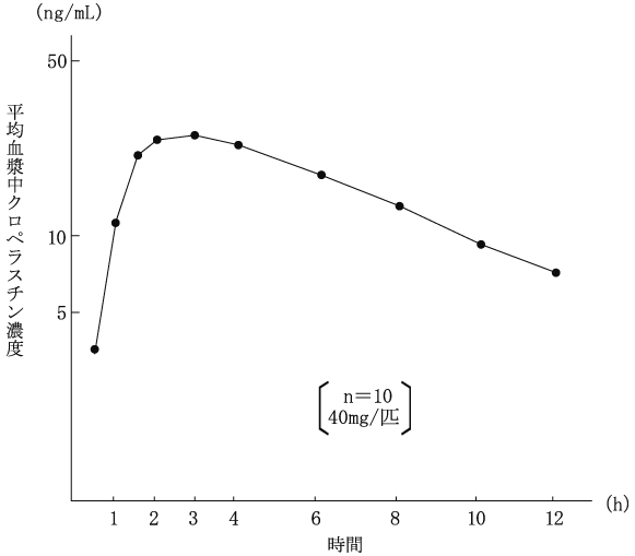 イヌにクロペラスチン塩酸塩40mgを経口投与した場合、投与後1.5~4時間で最高血中濃度に達し、最高血中濃度は、12~58ng/mLである。また、血中濃度曲線下面積(AUC)は68.8~333.8ng・h/mLである。