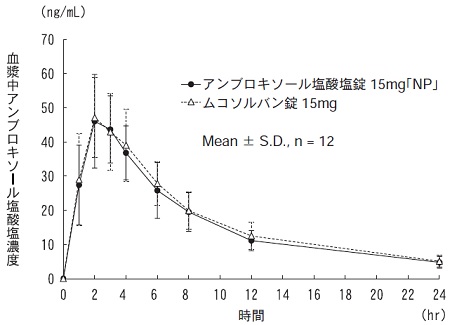 アンブロキソール塩酸塩錠15mg「NP」とムコソルバン錠15mgのそれぞれ2錠(アンブロキソール塩酸塩として30mg)注1)を、クロスオーバー法により健康成人男子に絶食単回経口投与して血漿中アンブロキソール塩酸塩濃度を測定した。得られた薬物動態パラメータ(AUC0→24hr、Cmax)について統計解析を行った結果、両剤の生物学的同等性が確認された1)。