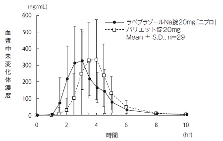 ラベプラゾールNa錠20mg「ニプロ」とパリエット錠20mgのそれぞれ1錠(ラベプラゾールナトリウムとして20mg)を、クロスオーバー法により健康成人男子に絶食単回経口投与して血漿中ラベプラゾールナトリウム未変化体濃度を測定した。得られた薬物動態パラメータ(AUC0→10hr、Cmax)について90%信頼区間法にて統計解析を行った結果、log(0.80)~log(1.25)の範囲内であり、両剤の生物学的同等性が確認された3)。