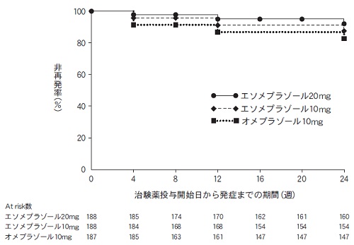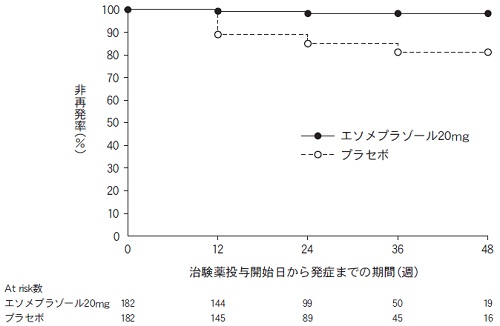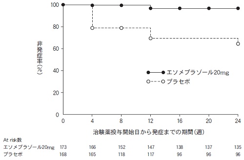 消化性潰瘍の既往を有する低用量アスピリン(81~324mg)継続服用患者(日本人患者含む)を対象としたアジア共同第III相比較試験の中間解析における結果において、エソメプラゾール20mgの1日1回48週間投与時における胃潰瘍又は十二指腸潰瘍の再発抑制効果が認められている。さらに、中間解析以降、本薬群の被験者のみ投与が継続され、エソメプラゾール20mgを1日1回最長72週間投与時において、投与72週後の非発症率は96.4%であった。なお、本試験においては本薬群、プラセボ群ともに全例ゲファルナートを併用していた18),19)。