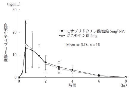 モサプリドクエン酸塩錠5mg「NP」とガスモチン錠5mgのそれぞれ1錠(モサプリドクエン酸塩として5mg)を、クロスオーバー法により健康成人男子に絶食単回経口投与して血漿中モサプリド濃度を測定した。得られたそれぞれの薬物動態パラメータ(AUC0→8hr、Cmax)について90%信頼区間法にて統計解析を行った結果、log(0.80)~log(1.25)の範囲内であり、両剤の生物学的同等性が確認された3)。