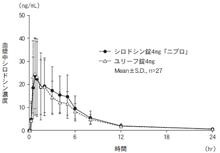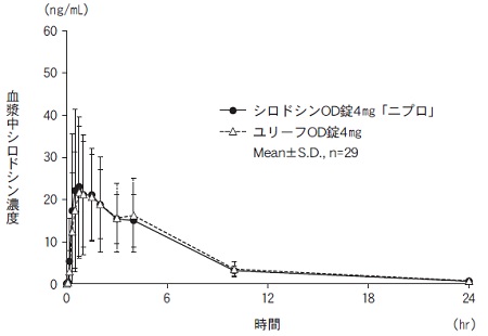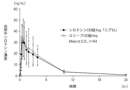 シロドシン錠4mg「ニプロ」とユリーフ錠4mgのそれぞれ1錠(シロドシンとして4mg)を、クロスオーバー法により健康成人男子に絶食単回経口投与して血漿中シロドシン濃度を測定した。得られた薬物動態パラメータ(AUC0→24hr、Cmax)について90%信頼区間法にて統計解析を行った結果、log(0.80)~log(1.25)の範囲内であり、両剤の生物学的同等性が確認された8)。