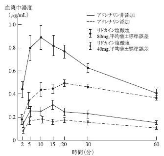 健康成人に2%リドカイン液2mL又は4mL(リドカイン塩酸塩40mg又は80mg)を単独あるいはアドレナリンを添加(1:80,000)して下顎孔伝達麻酔・頬側浸潤麻酔に用いたとき、アドレナリン添加時の血漿中濃度は、単独投与時に比べ最高濃度の有意な低下、最高濃度到達時間の有意な延長が認められた1)。