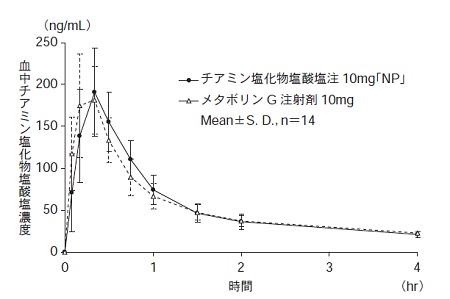 チアミン塩化物塩酸塩注10mg「NP」とメタボリンG注射液10mgのそれぞれ2mL(チアミン塩化物塩酸塩として20mg)を、クロスオーバー法により健康成人男子に絶食時に筋肉内投与して血中未変化体濃度を測定した。得られた薬物動態パラメータ(AUC0→4hr、Cmax)の平均値の差の95%信頼区間は±20%の範囲にあり、両剤の生物学的同等性が確認された1)。