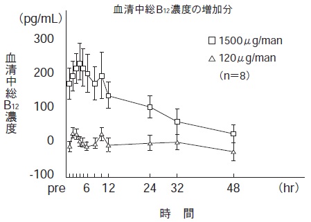 健康成人男子に1,500μgを12週間反復経口投与し、投与中止後4週間の血清中総B12量の変動率を検討した。投与4週間で投与前値の約2倍に達し、以後も漸増し、12週後には約2.8倍を示した。投与中止4週後でも投与前値の約1.8倍を示した2) 。