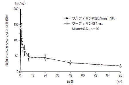 ワルファリンK錠0.5mg「NP」2錠とワーファリン錠1mg1錠(ワルファリンカリウムとして1mg)を、クロスオーバー法により健康成人男子に絶食単回経口投与して血漿中ワルファリンカリウム濃度を測定した。得られた薬物動態パラメータ(AUC0→96hr、Cmax)について90%信頼区間法にて統計解析を行った結果、log(0.80)~log(1.25)の範囲内であり、両剤の生物学的同等性が確認された8)。