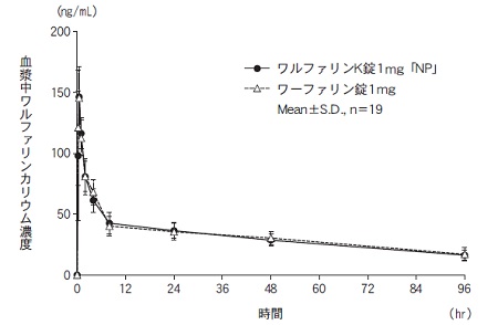 ワルファリンK錠1mg「NP」とワーファリン錠1mgのそれぞれ1錠(ワルファリンカリウムとして1mg)を、クロスオーバー法により健康成人男子に絶食単回経口投与して血漿中ワルファリンカリウム濃度を測定した。得られた薬物動態パラメータ(AUC0→96hr、Cmax)について90%信頼区間法にて統計解析を行った結果、log(0.80)~log(1.25)の範囲内であり、両剤の生物学的同等性が確認された9)。