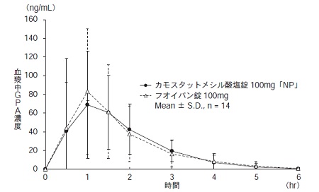 カモスタットメシル酸塩錠100mg「NP」とフオイパン錠100mgのそれぞれ2錠(カモスタットメシル酸塩として200mg)を、クロスオーバー法により健康成人男子に絶食時に経口投与して血漿中活性代謝物GPA[4-(4-グアニジノベンゾイルオキシ)フェニル酢酸]濃度を測定した。得られた薬物動態パラメータ(AUC0→6hr、Cmax)の平均値の差の95%信頼区間は±20%の範囲にあり、両剤の生物学的同等性が確認された3)。