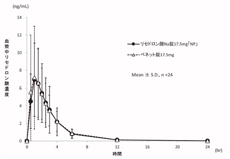 リセドロン酸Na錠17.5mg「NP」とベネット錠17.5mgのそれぞれ1錠(リセドロン酸ナトリウムとして17.5mg)を、クロスオーバー法により健康成人男子に絶食単回経口投与して血漿中リセドロン酸濃度を測定した。得られた薬物動態パラメータ(AUC0→24hr、Cmax)について統計解析を行った結果、両剤の生物学的同等性が確認された6)。