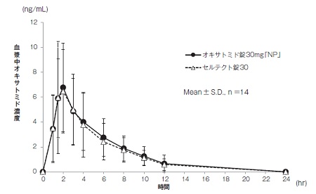 オキサトミド錠30mg「NP」とセルテクト錠30のそれぞれ1錠(オキサトミドとして30mg)を、クロスオーバー法により健康成人男子に絶食単回経口投与して血漿中オキサトミド濃度を測定した。得られた薬物動態パラメータ(AUC0→24hr、Cmax)について統計解析を行った結果、両剤の生物学的同等性が確認された3)。