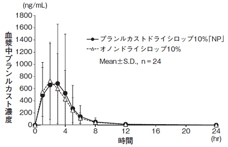 プランルカストドライシロップ10%「NP」とオノンドライシロップ10%のそれぞれ2.25g(プランルカスト水和物として225mg)を、クロスオーバー法により健康成人男子に絶食単回経口投与して血漿中未変化体濃度を測定した。得られた薬物動態パラメータ(AUC0→24hr、Cmax)について90%信頼区間法にて統計解析を行った結果、log(0.80)~log(1.25)の範囲内であり、両剤の生物学的同等性が確認された4)。