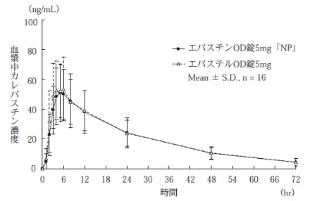 エバスチンOD錠5mg「NP」とエバステルOD錠5mgのそれぞれ1錠(エバスチンとして5mg)を、クロスオーバー法により健康成人男子に絶食単回経口投与して血漿中カレバスチン濃度を測定した。得られた薬物動態パラメータ(AUC0→72hr、Cmax)について90%信頼区間法にて統計解析を行った結果、log(0.80)~log(1.25)の範囲内であり、両剤の生物学的同等性が確認された2)。