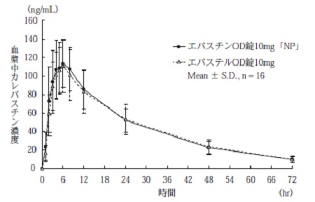 エバスチンOD錠10mg「NP」とエバステルOD錠10mgのそれぞれ1錠(エバスチンとして10mg)を、クロスオーバー法により健康成人男子に絶食単回経口投与して血漿中カレバスチン濃度を測定した。得られた薬物動態パラメータ(AUC0→72hr、Cmax)について90%信頼区間法にて統計解析を行った結果、log(0.80)~log(1.25)の範囲内であり、両剤の生物学的同等性が確認された3)。