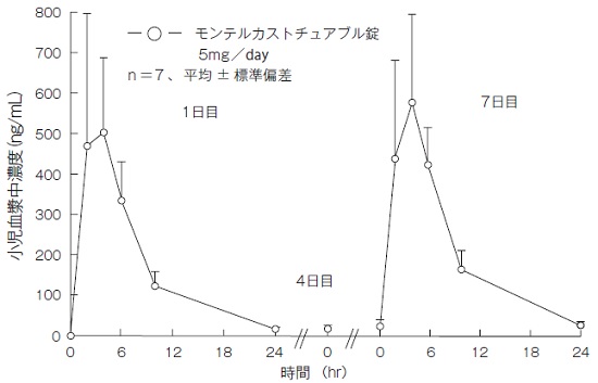 軽症から中等症の小児気管支喘息患者にモンテルカストチュアブル錠5mgを1日1回7日間食後反復経口投与したとき、1日目は投与後3.1時間、7日目は投与後4.3時間にCmax(630ng/mL及び628ng/mL)に達し、t1/2はいずれもおよそ4時間であった(下図)。1日目及び7日目のAUC0-24hrはそれぞれ4170ng・hr/mL及び4910ng・hr/mLであった。血漿中にモンテルカストはほとんど蓄積しないことが示唆された(表1)4),5)。
