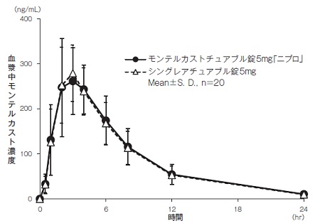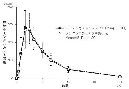 モンテルカストチュアブル錠5mg「ニプロ」とシングレアチュアブル錠5mgのそれぞれ1錠(モンテルカストとして5mg)を、クロスオーバー法により健康成人男子に絶食単回経口投与して血漿中モンテルカスト濃度を測定した。得られた薬物動態パラメータ(AUC0→24hr、Cmax)について90%信頼区間法にて統計解析を行った結果、log(0.80)~log(1.25)の範囲内であり、両剤の生物学的同等性が確認された7),8),9),10)。