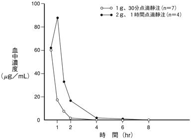 健康成人にピペラシリンナトリウム1g及び2gをそれぞれ30分、1時間点滴静注にて単回投与したときの血中濃度の推移は以下のとおりであった4),5)。