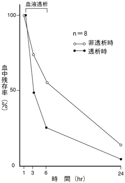 血液透析中の慢性腎不全患者8例にピペラシリンナトリウム2gを投与し、投与1時間後から5時間血液透析を行ったときの血中濃度の推移は以下のとおりであった(静注データ)15)。