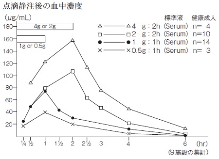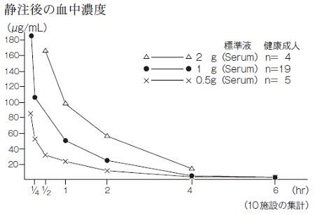 健康成人にセフメタゾールナトリウム1g(力価)を1時間点滴静注した場合の血中濃度は点滴終了時に最高値に達し、その平均は76.2μg/mL、6時間後には2.7μg/mLを示し、血中濃度半減期は1.1時間前後である。血中濃度に用量依存性が認められる2)。