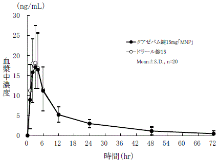 クアゼパム錠20mg「MNP」とドラール錠20を、クロスオーバー法によりそれぞれ1錠(クアゼパムとして20mg)健康成人男子に絶食時単回経口投与して血漿中未変化体濃度を測定し、得られた薬物動態パラメータ(AUC、Cmax)について90%信頼区間法にて統計解析を行った結果、log(0.8)~log(1.25)の範囲内であり、両製剤の生物学的同等性が確認された3) 。