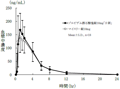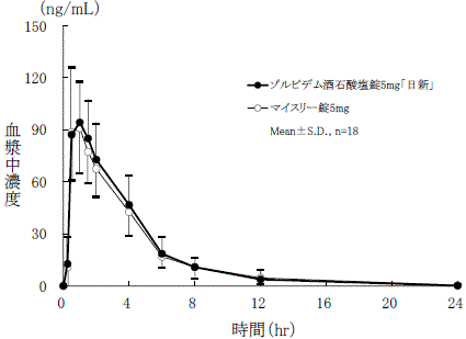 ゾルピデム酒石酸塩錠5mg「日新」とマイスリー錠5mgを、クロスオーバー法によりそれぞれ1錠(ゾルピデム酒石酸塩として5mg)健康成人男子に絶食時単回経口投与して血漿中未変化体濃度を測定し、得られた薬物動態パラメータ(AUC、Cmax)について90%信頼区間法にて統計解析を行った結果、log(0.80)~log(1.25)の範囲内であり、両製剤の生物学的同等性が確認された1) 。