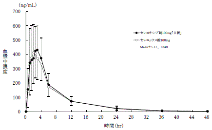 セレコキシブ錠100mg「日新」とセレコックス錠100mgを、クロスオーバー法によりそれぞれ1錠(セレコキシブとして100mg)健康成人男子に絶食時単回経口投与して血漿中未変化体濃度を測定し、得られた薬物動態パラメータ(AUC、Cmax)について90%信頼区間法にて統計解析を行った結果、log(0.80)~log(1.25)の範囲内であり、両製剤の生物学的同等性が確認された5) 。