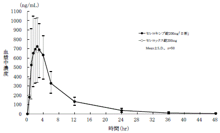 セレコキシブ錠200mg「日新」とセレコックス錠200mgを、クロスオーバー法によりそれぞれ1錠(セレコキシブとして200mg)健康成人男子に絶食時単回経口投与して血漿中未変化体濃度を測定し、得られた薬物動態パラメータ(AUC、Cmax)について90%信頼区間法にて統計解析を行った結果、log(0.80)~log(1.25)の範囲内であり、両製剤の生物学的同等性が確認された6) 。