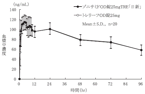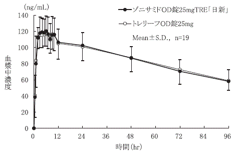 ゾニサミドOD錠25mgTRE「日新」とトレリーフOD錠25mgを、クロスオーバー法によりそれぞれ1錠(ゾニサミドとして25mg)健康成人男子に絶食時単回経口投与(水で服用及び水なしで服用)して血漿中未変化体濃度を測定し、得られた薬物動態パラメータ(AUC、Cmax)について統計解析を行った結果、対数値の平均値の差の90%信頼区間がlog(0.80)~log(1.25)の範囲内であり、且つ、対数値の平均値の差(薬剤間差)がlog(0.90)~log(1.11)の範囲内であったことから、両製剤の生物学的同等性が確認された4) 。