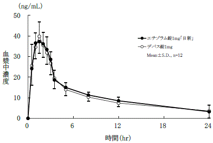 エチゾラム錠1mg「日新」とデパス錠1mgを、クロスオーバー法によりそれぞれ1錠(エチゾラムとして1mg)健康成人に絶食時単回経口投与して血漿中未変化体濃度を測定し、得られた薬物動態パラメータ(AUC、Cmax)について統計解析を行った結果、両製剤の生物学的同等性が確認された2) 。