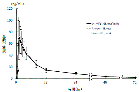 ミルタザピン錠15mg「日新」は、「含量が異なる経口固形製剤の生物学的同等性試験ガイドライン(平成24年2月29日 薬食審査発0229第10号)」に基づき、ミルタザピン錠30mg「日新」を標準製剤としたとき、溶出挙動が同等と判断され、生物学的に同等とみなされた13) 。