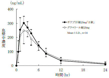 チアプリド錠25mg「日新」とグラマリール錠25mgを、クロスオーバー法によりそれぞれ2錠(チアプリドとして50mg)健康成人男子に絶食時単回経口投与して血漿中未変化体濃度を測定し、得られた薬物動態パラメータ(AUC、Cmax)について統計解析を行った結果、両製剤の生物学的同等性が確認された1) 。