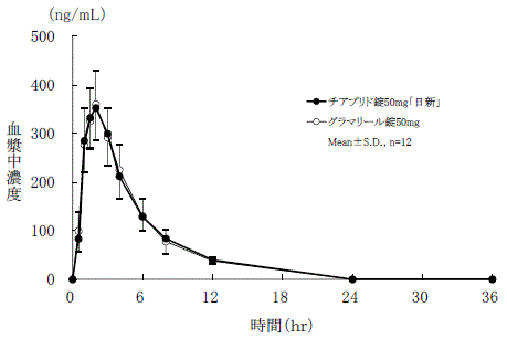チアプリド錠50mg「日新」とグラマリール錠50mgを、クロスオーバー法によりそれぞれ1錠(チアプリドとして50mg)健康成人男子に絶食時単回経口投与して血漿中未変化体濃度を測定し、得られた薬物動態パラメータ(AUC、Cmax)について統計解析を行った結果、両製剤の生物学的同等性が確認された2) 。