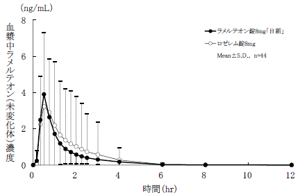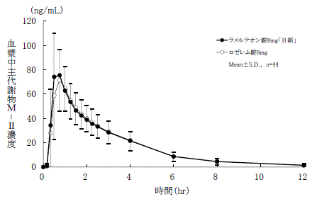 ラメルテオン錠8mg「日新」とロゼレム錠8mgを、クロスオーバー法によりそれぞれ1錠(ラメルテオンとして8mg)健康成人男子に絶食時単回経口投与して血漿中主代謝物M-Ⅱ濃度及び血漿中ラメルテオン(未変化体)濃度を測定した。生物学的同等性評価パラメータである血漿中M-ⅡのCmax及びAUC0-12の薬剤間差の90%信頼区間は、生物学的同等性の判定基準log(0.80)~log(1.25)を満たした。また、副次評価対象物である血漿中ラメルテオンのCmax及びAUC0-12の薬剤間差の90%信頼区間は、log(0.80)~log(1.25)の範囲内であった。以上より、ラメルテオン錠8mg「日新」とロゼレム錠8mgは生物学的に同等であると判断した1) 。