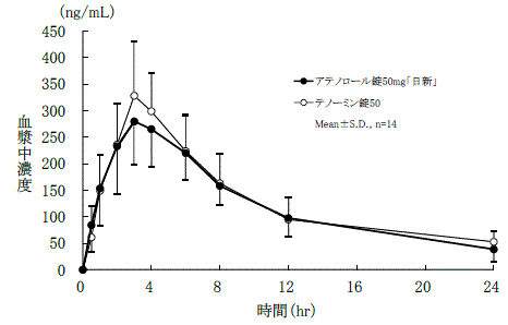 アテノロール錠50mg「日新」とテノーミン錠50を、クロスオーバー法によりそれぞれ1錠(アテノロールとして50mg)健康成人男子に絶食時単回経口投与して血漿中未変化体濃度を測定し、得られた薬物動態パラメータ(AUC、Cmax)について統計解析を行った結果、両製剤の生物学的同等性が確認された1) 。