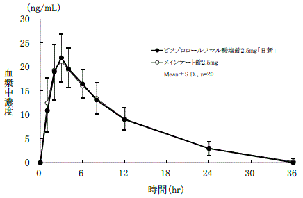 ビソプロロールフマル酸塩錠2.5mg「日新」とメインテート錠2.5mgを、クロスオーバー法によりそれぞれ2錠(ビソプロロールフマル酸塩として5mg)健康成人男子に絶食時単回経口投与して血漿中未変化体濃度を測定し、得られた薬物動態パラメータ(AUC、Cmax)について90%信頼区間法にて統計解析を行った結果、log(0.8)〜log(1.25)の範囲内であり、両製剤の生物学的同等性が確認された2) 。